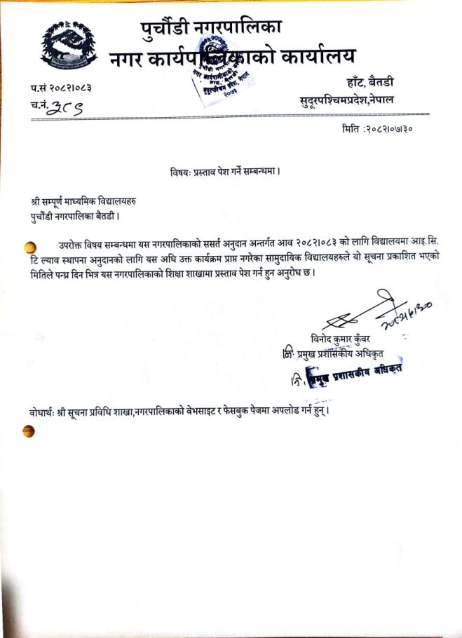 आइ.सि.टि. ल्याव स्थापना अनुदानको लागि प्रस्ताव पेश गर्ने सम्बन्धमा ।