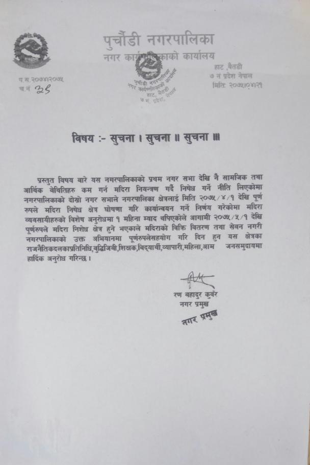 पुर्चौडी नगरपालिका लाई मदिरा_निषेध_छेत्र बनाउने उच्चा विचार भएका यहाँ का नगर प्रमुख लाई सबै को साथको आपेक्ष्या र सफलता को कामना //
